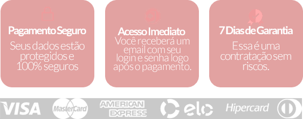 O que isso significa? Que essa é uma contratação sem riscos. Você pode experimentar o curso por 7 dias e, caso não se adapte, ter todo o dinheiro investido de volta. Agora você não tem mais desculpas para ficar de fora!